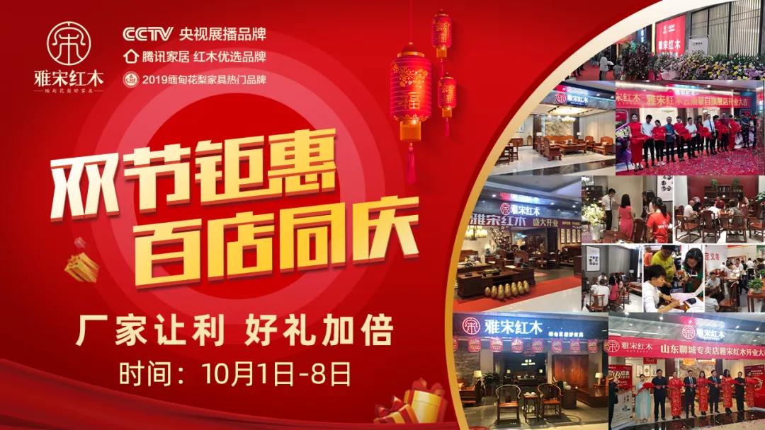 當(dāng)中秋遇上國(guó)慶,舉國(guó)歡騰。此次特別的國(guó)慶節(jié),騰訊家居優(yōu)選品牌雅宋紅木推出“雙節(jié)鉅惠、百店同慶、廠家讓利”全國(guó)聯(lián)動(dòng)活動(dòng),全國(guó)百家專(zhuān)賣(mài)門(mén)店統(tǒng)一行動(dòng),廠家讓利,多款家具超值鉅惠放送,開(kāi)啟雅宋紅木2020金秋盛宴。